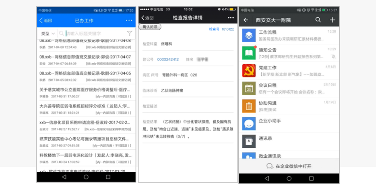 ▊公司介紹: 西安交通大學(xué)第一附屬醫(yī)院于1956年建院,是國(guó)家衛(wèi)生計(jì)生委委管大型綜合性三級(jí)甲等醫(yī)院,是全國(guó)首批暨陜西省首家“三級(jí)甲等醫(yī)院”、全國(guó)首批“百佳醫(yī)院”, 目前在職職工4400余人,開放床位2560張;2016年服務(wù)門急診患者241萬(wàn)、住院患者11.8萬(wàn) 按照“兩院四區(qū)”的戰(zhàn)略布局,目前已經(jīng)全面托管了陜西省彬縣中醫(yī)醫(yī)院、韓城民楊醫(yī)院等基層醫(yī)院,并全力推進(jìn)國(guó)際陸港醫(yī)院、興善寺分院、延安新區(qū)醫(yī)院等合作項(xiàng)目。 ▊項(xiàng)目需求: 1、將HIS系統(tǒng)等業(yè)務(wù)數(shù)據(jù)集成到 宇淼 OA頁(yè)面中集中展現(xiàn),如醫(yī)院門診、護(hù)理等業(yè)務(wù)信息,方便院內(nèi)領(lǐng)導(dǎo)、職工實(shí)時(shí)查看; 2、管理信息化,醫(yī)院行政辦公流程電子化、信息化,利用軟件系統(tǒng)輔助醫(yī)院日常管理,減輕醫(yī)院職工處理日常事物工作強(qiáng)度; 3、滿足醫(yī)院移動(dòng)化辦公的需求,提高業(yè)務(wù)、辦公事務(wù)處理效率 ▊項(xiàng)目建設(shè)內(nèi)容: 1、將醫(yī)院HIS系統(tǒng)數(shù)據(jù)集成到OA中,并形成報(bào)表門戶頁(yè)面,同時(shí)支持在PC端、移動(dòng)端訪問(wèn),便于院內(nèi)領(lǐng)導(dǎo)、職工時(shí)刻掌握醫(yī)院各項(xiàng)院務(wù)信息;實(shí)現(xiàn)單點(diǎn)登錄,便捷日常使用。 2、流程管理應(yīng)用:完成了醫(yī)院內(nèi)從行政辦公到醫(yī)院日常業(yè)務(wù),所有板塊合計(jì)200多條流程的電子化,包含門診、護(hù)理、采購(gòu)乃至醫(yī)風(fēng)醫(yī)德建設(shè)等所有流程,還可通過(guò)可視化流程圖對(duì)流程進(jìn)度進(jìn)行追蹤,只需通過(guò)后端引擎配置實(shí)現(xiàn),不需要開發(fā)。同時(shí)也支持集團(tuán)化分級(jí)分權(quán)管理和移動(dòng)端應(yīng)用。 3、提供移動(dòng)端App 和微信應(yīng)用,通過(guò)手機(jī)即可完成: ①醫(yī)生查房:查看患者各項(xiàng)信息、危急值,隨時(shí)隨地掌控患者的病情,及時(shí)根據(jù)患者病情對(duì)患者治療方案進(jìn)行調(diào)整; ②流程查看、處理 選擇 工作流程--選中流程--辦理流程--選擇人員轉(zhuǎn)發(fā)--提交完成 ③醫(yī)院公文、通知公告提醒;組織成員即時(shí)通訊、群組會(huì)話等 ▊項(xiàng)目?jī)r(jià)值: 1、醫(yī)院HIS系統(tǒng)數(shù)據(jù)集成,發(fā)布到報(bào)表門戶頁(yè)面集中展現(xiàn),并支持PC端和移動(dòng)端同步查看,方便院領(lǐng)導(dǎo)、職工時(shí)刻掌握醫(yī)院的業(yè)務(wù)運(yùn)營(yíng)狀態(tài); 2、實(shí)現(xiàn)了院內(nèi)流程的全面電子化,涵蓋醫(yī)院所有業(yè)務(wù)板塊、合計(jì)200多條流程。系統(tǒng)部署半年后,流程流轉(zhuǎn)總數(shù):9萬(wàn)余條,其中已辦率98.29%。提高辦事效率的同時(shí),也促進(jìn)了醫(yī)院各部的規(guī)范化管理; 3、移動(dòng)端App、微信應(yīng)用,全院全業(yè)務(wù)支持移動(dòng)化管理,隨時(shí)隨地處理醫(yī)院事務(wù),大大提升全院溝通效率;平臺(tái)賬號(hào)5335個(gè),總登錄人次70萬(wàn)余人次,移動(dòng)辦公登錄超過(guò)四分之一; 4、為醫(yī)院構(gòu)建的統(tǒng)一知識(shí)管理平臺(tái),半年內(nèi): · 文檔創(chuàng)建總數(shù):92000多條 · 文檔下載次數(shù):27萬(wàn)余條 · 完成網(wǎng)上調(diào)查:7百余條